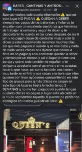 Una de las afectadas advirtió en redes sociales, que tengan cuidado si están interesadas en trabajar en este centro nocturno pues van a trabajar para llenar los bolsillos de los dueños sin las chicas recibir un solo peso.