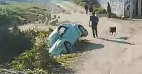 El hombre quedó al margen de una barranca y se salvó de caer al vacío, pues vecinos salieron a ayudarlo a salir del vehículo.