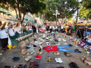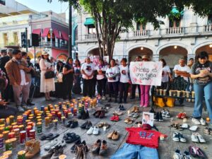 Colocó la ropa y zapatos de su hijo, rodeado de 400 veladoras y decenas de pares de zapatos de desaparecidos en Puebla.