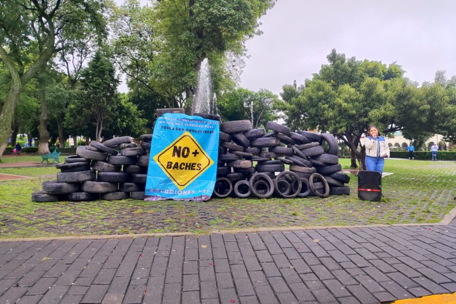 Hartos de baches y abandono del gobierno de Tonantzin, ponen pirámide de llantas ponchadas en Cholula