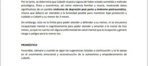 Es importante mencionar que Liz cuenta con valoraciones psicológicas que especifican que la mujer muestra signos de haber estado sometida a “Maltrato físico, psicológico y económico” así como violencia familiar y vicaria. Sin embargo, aclaran los dictámenes que no se encuentra un problema en ella que impida estar con su hija.