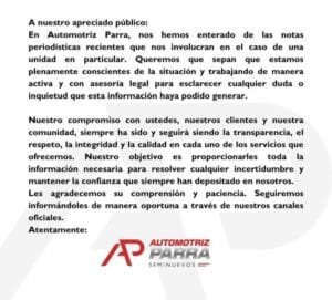 Este lunes 6 de enero, la Agencia en la cual se vende la camioneta robada, compartió en sus redes sociales un comunicado escueto en el que no desmienten la versión de Aldo y tampoco la confirman.