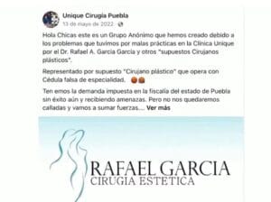 Rafael García no tiene certificado de cirugía plástica estética y después de que un medio nacional difundió la noticia de cirugía mal practicada que cobró la vida de Verónica, dejó de operar en las Torres Médicas y migró a un consultorio en la colonia Santa María en Puebla.