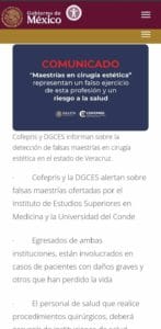 Además descubrió el comunicado de la Cofepris, donde informa la detección de maestrías en cirugía estética y longevidad ofertadas por dicho instituto y la Universidad del Conde ubicados en Veracruz.