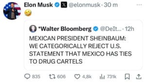A los dimes y diretes se sumó el multimillonario empresario Elon Musk, quien es el titular del Departamento de Eficiencia Gubernamental de Estados Unidos, se burló de la declaración de la presidenta Claudia Sheinbaum Pardo, quien rechazó la acusación de la Casa Blanca sobre una supuesta alianza entre el gobierno mexicano y los cárteles.